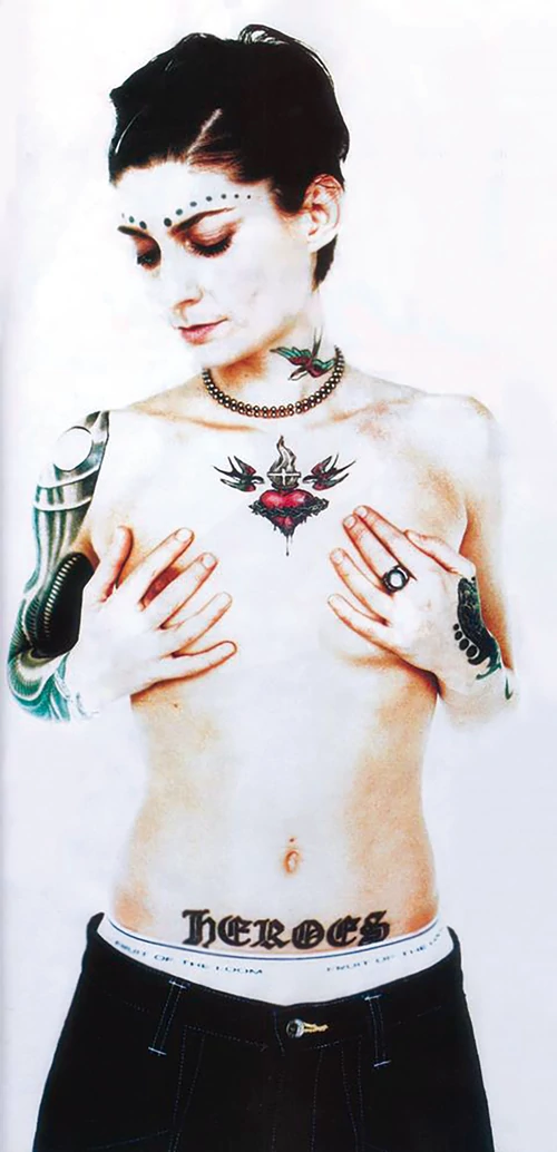 C’est lors d’un voyage à New York en 1995, alors que la Grosse Pomme est encore la mégalopole de tous les possibles, qu’elle va trouver à la fois son style musical et son look qui ne ressemble à aucun autre. En virée au Sound Factory - l’immense club gay et kétaminé où officie le Dieu des platines Junior Vasquez - elle découvre la hard house, une déclinaison plus tribale et mentale de la house dont elle va remplir ses flight cases. Puis croisant une fille dans la rue qui arbore fièrement des points tatoués au-dessus des sourcils, elle décide de l’imiter quitte à devenir accro à l’aiguille comme le confirme Stan, son meilleur ami et agent : « elle n’y allait pas de main morte, comme je la voyais tous les jours, je voyais l’encre se répandre. Le dernier qu’elle s’est fait était un pistolet, signé comme d’habitude par Tintin, son tatoueur préféré. En fait, elle y allait tous les deux mois. Elle commençait une pièce, en finissait une autre ou faisait simplement repasser les traits des plus anciens. »