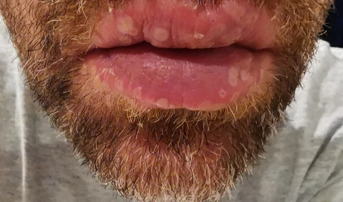 Les premiers symptômes sont apparus 4 jours plus tard sous la forme d'une myriade de "boutons de fièvre" sur les 2 lèvres. Étant facilement sujet à l'herpès quand je pousse les potards dans ma tête à fond (groooooosse fatigue, gros ensoleillement, contrariétés...), il n'est pas rare de sentir venir un bouton de fièvre labial ; les réflexes se nomment Valaciclovir, HurgoGel...