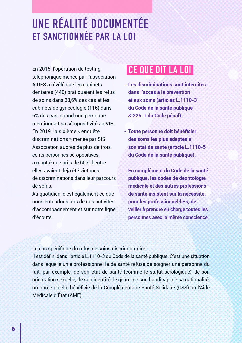 La brochure est à la fois un outil d’information et de médiation entre professionnel·le·s et personnes concernées. Elle rappelle ce que prévoit la loi, dans ce genre de situation, et elle encourage les personnes à ne pas rester seules faces aux discriminations qu’elles subissent. Il est important de les dénoncer afin de générer une prise de conscience et d’éviter qu’elles ne se reproduisent. Les procédures initiées auprès du Défenseur des droits, d’un Ordre professionnel ou de l’Assurance maladie peuvent être longues, d’où l’intérêt de se rapprocher d’une association qui pourra à la fois aider les personnes à trouver des professionnel·le·s de santé qualifié·e·s, tout en les accompagnant au mieux dans leurs démarches. Certaines associations, qui proposent des dispositifs d’accompagnement des personnes (Sida Info Service, Les Séropotes, France Assos Santé), sont répertoriées dans la brochure.