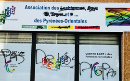 Le 5 juin dernier, quelques jours avant la dernière Pride de Perpignan, le centre LGBT+ a encore subi des dégradations : les termes « lesbiennes », « gays » et « trans » ont été barrés, ainsi que le logo de l’association. Une croix celtique (symbole de certains groupes revendiqués d’extrême droite) étaient dessinée sous ce slogan : « pas de vos propagandes ici ».