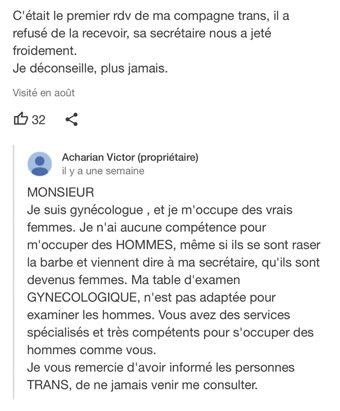 Le praticien mis en cause, un certain Dr Victor Acharian, basé à Pau, lui répond avec un message particulièrement ordurier [ les majuscules figurent dans le commentaire original et nous avons pris la liberté de corriger les nombreuses fautes, pour plus de lisibilité, ndlr ] : « MONSIEUR, je m’occupe des vraies femmes même s’ils se sont rasés la barbe et viennent dire à ma secrétaire qu’ils sont devenus femmes. Ma table d’examen GYNÉCOLOGIQUE n’est pas adaptée pour examiner les hommes. Vous avez des services spécialisés et très compétents pour examiner des hommes comme vous. Je vous remercie d’avoir informé les personnes TRANS de ne jamais venir me consulter. »