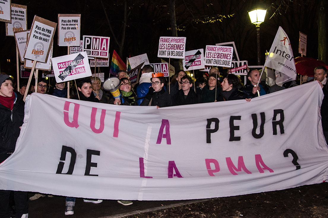 Le 6 janvier, quelque 200 personnes, à l’appel des collectifs LGBT Fières et Oui Oui Oui, manifestent près du ministère de la Famille, non loin des Invalides, pour exiger que le gouvernement tienne ses engagements sur la PMA. Sur la banderole principale, du rassemblement on peut lire « Qui a peur de la PMA? »