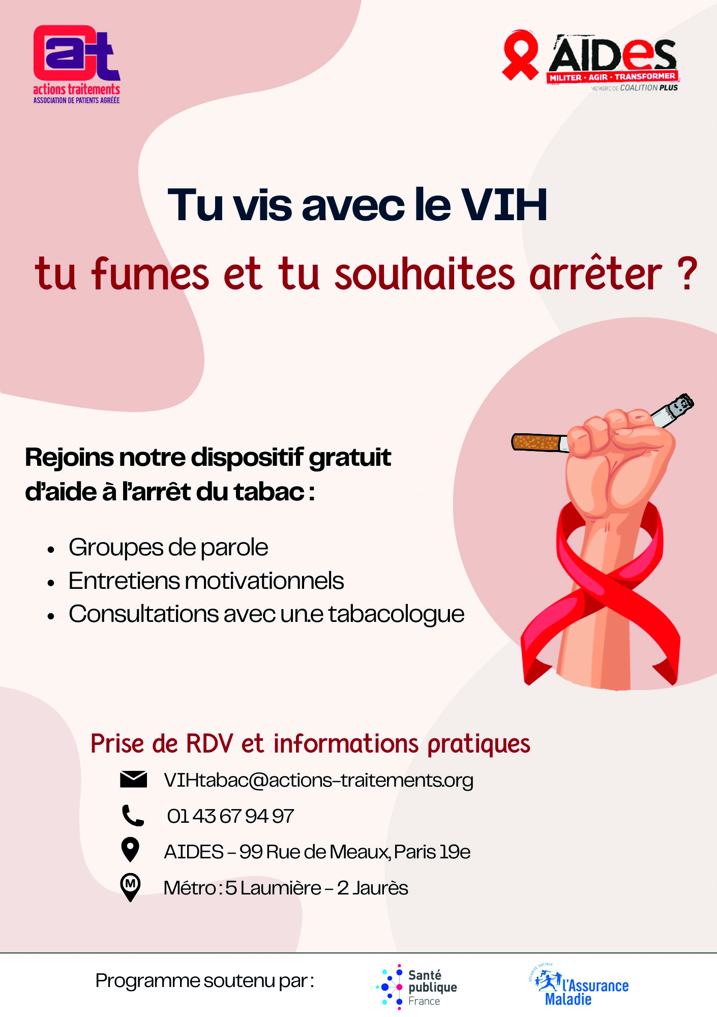 Dans la foulée de l’enquête nationale Tabac & VIH, Actions Traitements proposera dès le mois d’avril un dispositif d’aide et d’accompagnement à l’arrêt du tabac. Le programme est conçu en partenariat avec l’association AIDES et bénéficie du soutien de financier de deux institutions : Santé publique France et le fonds de lutte contre les addictions (Caisse Nationale d’Assurance Maladie). Destiné spécifiquement aux personnes vivant avec le VIH, ce dispositif se compose de groupes de parole, d’entretiens motivationnels et, surtout, de consultations (gratuites) avec une tabacologue. Il s’adresse (pour l’instant) aux personnes vivant en Île-de-France.Pour plus d’informations et la prise de rendez-vous, rendez-vous dans le paragraphe « Pour en savoir plus… » Les rendez-vous se dérouleront dans les locaux de l’association AIDES à Paris dans le 19e arrondissement. Les entretiens d’accueil débuteront à la mi-mars et seront réalisés par des personnes (d’Actions Traitements ou Aides selon les disponibilités) formées aux entretiens motivationnels. Les rendez-vous avec la tabacologue, débuteront dès le mois d’avril. Des entretiens motivationnels peuvent avoir lieu entre les rendez-vous avec la tabacologue, en fonction des besoins des personnes.Pour en savoir plus… Rendez-vous sur le nouveau site web d’Actions Traitements, rubrique « Ma prévention / Alcool, tabac » pour plus d’information