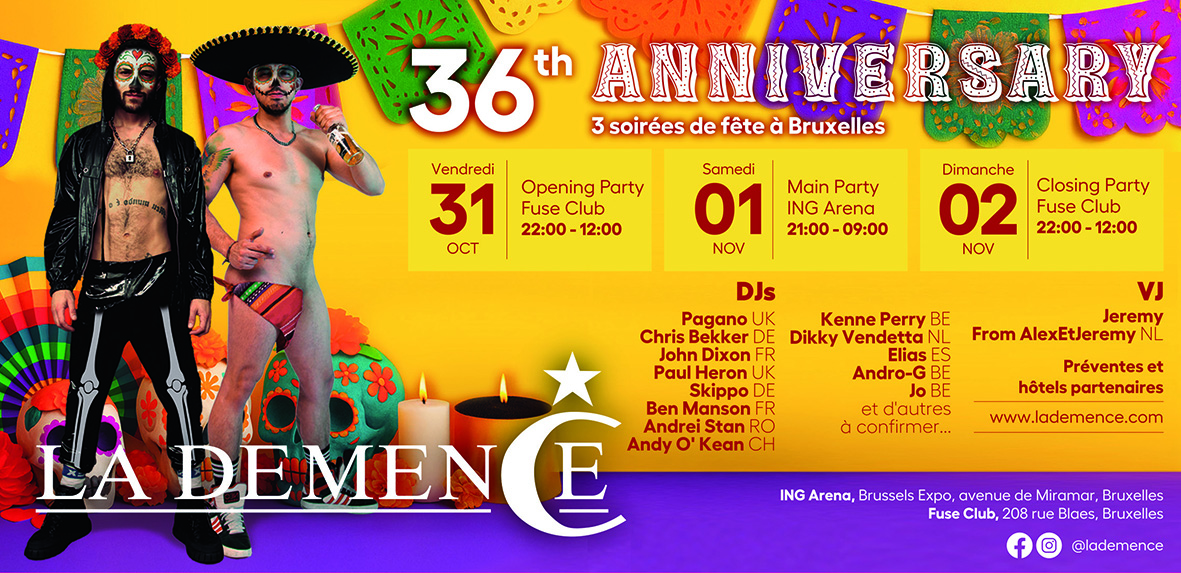 La Démence, la mythique fête gay célèbre cette année ses 36 ans. Du 31 octobre au 2 novembre 2025, vous allez autant sur les dancefloors que dans  les darkrooms, laisser s’exprimer sans retenue vos envies, vos corps. La soirée d’ouverture se fait au Fuse, discothèque emblématique de la ville, dans laquelle cette méga soirée attire chaque fois des milliers de clubbers venus de toute l’Europe.