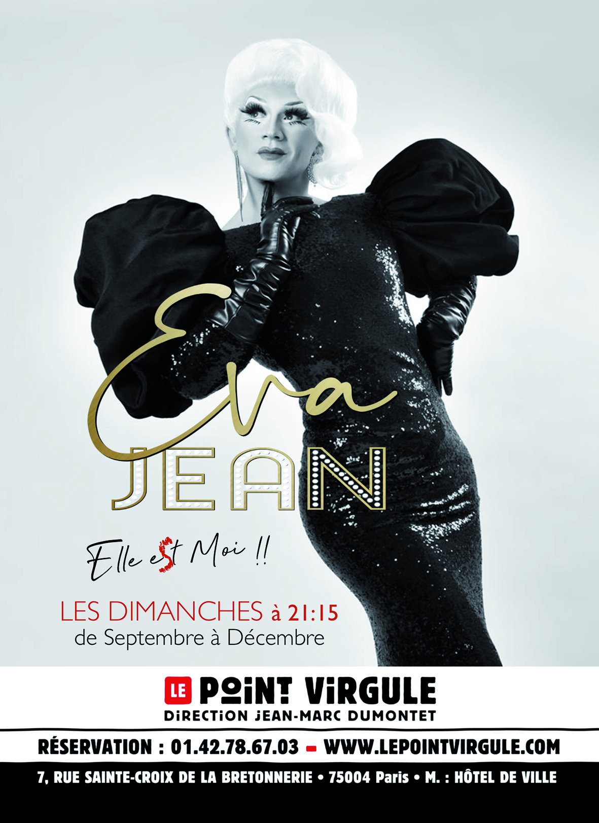 Eva Jean, le double féminin de David Jean, le coach vocal des comédies musicales, reprend possession du Point-Virgule pour un show tout en douceur mêlant esprit cabaret et musical. Si vous n’avez pas eu encore l’occasion de rencontrer ce personnage haut perché sur ces talons, il n’est pas trop tard. Au menu du chant, de la comédie, de l’humour et le drag bien entendu, le tout sur le flow feutré et ensorceleur du jazz. Une voix suave et troublante, chaude et enrobante avec des titres originaux qui vous ferons rêver. Infos et réservations : Le Point-Virgule, 7 rue Sainte-Croix-de-la-Bretonnerie, 75004 Paris