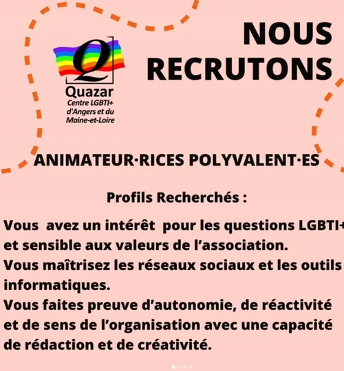 Le centre LGBTI+ angevin recrute 2 animateurs polyvalents (temps partiel). Les qualités recherchées : forcément un intérêt pour les questions LGBTI+, maîtrise des réseaux sociaux, capacité de rédaction et créativité. CV et lettre de motivation sont à envoyer à