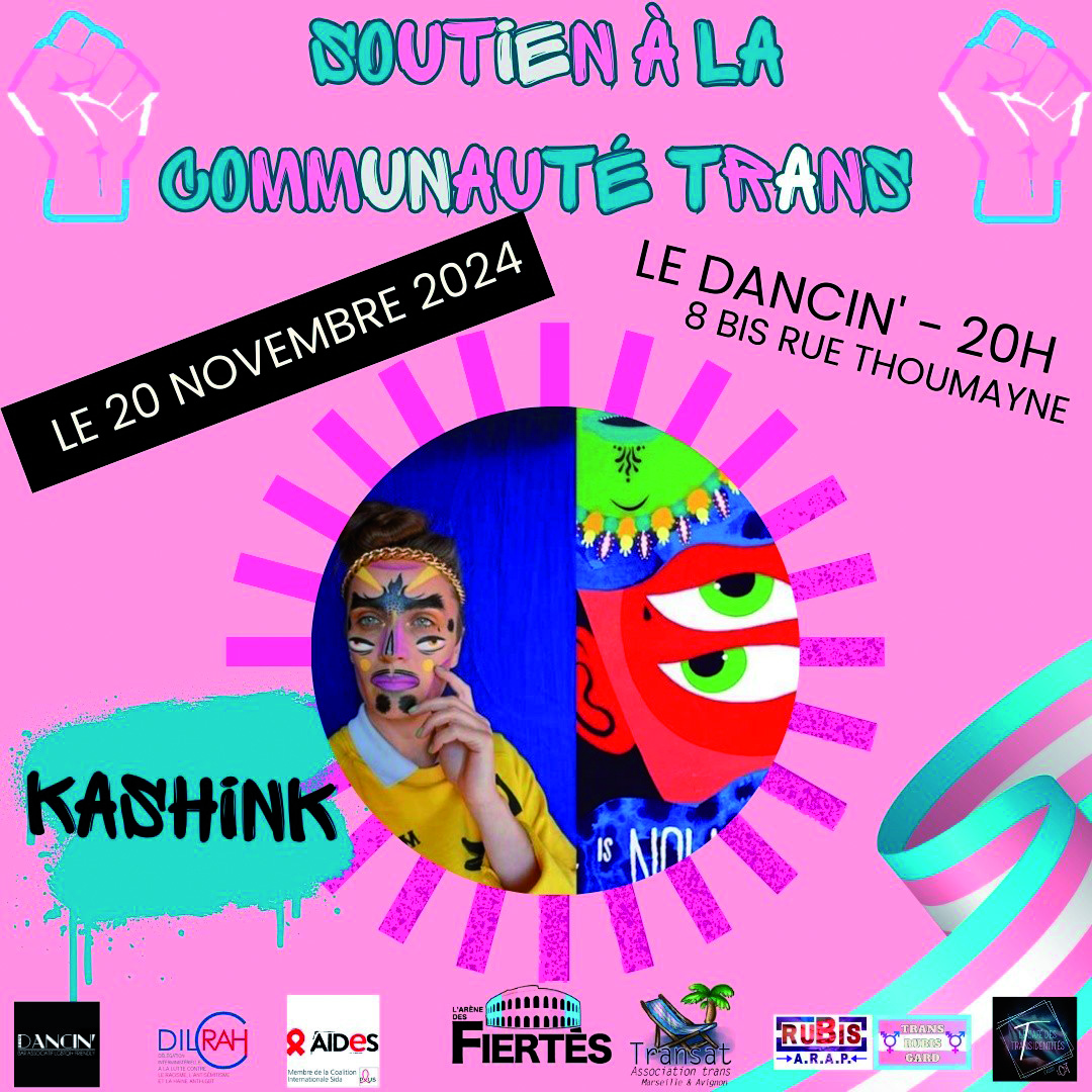 Dans le cadre de la journée du souvenir trans (20 novembre), une fresque a été réalisée par un-e artiste queer, en partenariat avec l’Arène des Fiertés et le Dancin’. Le travail de Kashink questionne les codes esthétiques et la définition de l’identité. L’artiste se considère comme activiste, pratiquant une forme d’art public. Iel porte quotidiennement une moustache dessinée au dessus des lèvres, comme deux traits d’eye liner.