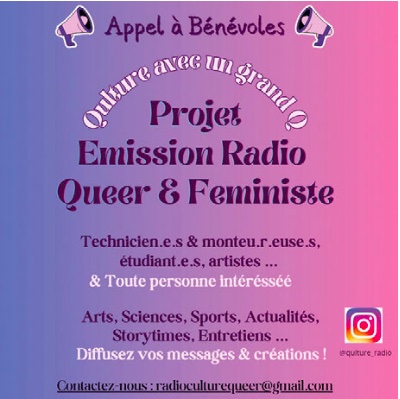 Saioa, Camille et Maïwenn recherchent toutes les bonnes volontés pour créer une émission de « culture queer, la culture avec un grand C : art, culture, littératures, sciences, actualité, sports, etc. » Monteur.euse, créateur.rice sonore, mais aussi chroniqueur.euses, l’envie vaut autant que l’expérience. On peut les contacter via : radioculturequeer@gmail.com ou instagram.com/qulture_radio.