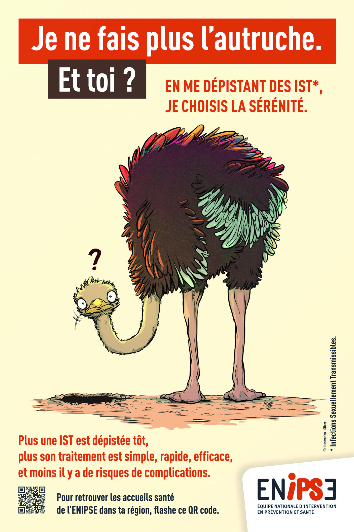 Face à l'augmentation préoccupante des infections sexuellement transmissibles (IST) et à un dépistage encore trop insuffisant, l’Enipse lance une nouvelle campagne de sensibilisation encourage chacun à agir pour sa santé. Intitulée « sortez la tête du sable et gagnez en sérénité ! », elle interpelle sur l'importance de sortir du déni et de prendre conscience des risques liés aux IST. L'allégorie de l'autruche, qui cache sa tête dans le sable, illustre parfaitement le message : il est temps de faire face à la réalité. Le visuel central de la campagne montre une autruche émergeant du sable, symbole d'une prise de conscience nécessaire. Le slogan engageant « en me dépistant des IST, je gagne en sérénité » met quant à lui en avant le bénéfice personnel d'un dépistage régulier : la tranquillité d'esprit. Les objectifs sont clairs : sensibiliser sur les risques des IST, souvent asymptomatiques, et encourager le dépistage précoce pour éviter des complications. A ceci s’ajoute l'orientation vers les accueils santé du réseau Enipse pour faciliter l'accès au dépistage. Cette campagne vise à toucher un large public, quel que soit le parcours.