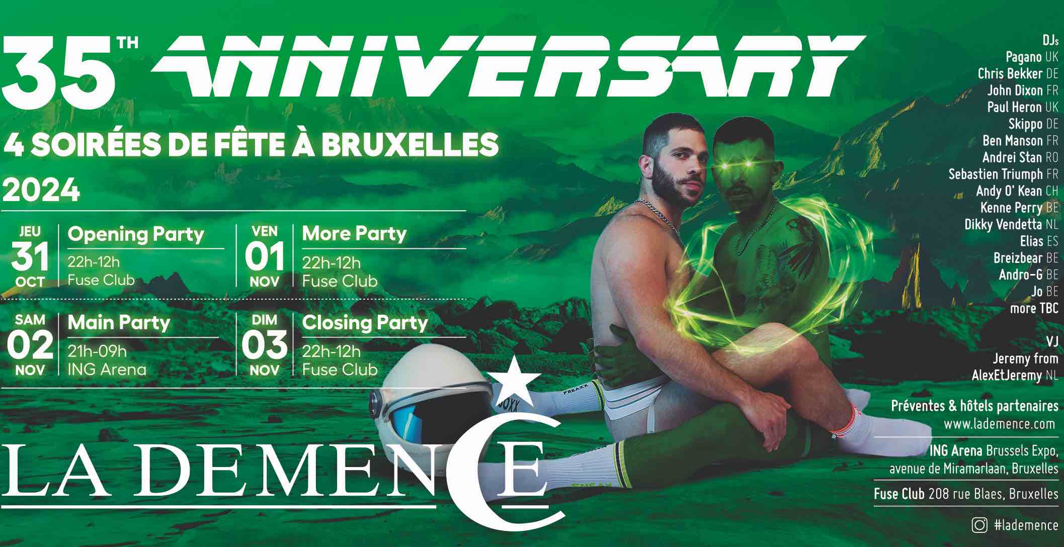 • Référence absolue des soirées gay européenne, La Démence fêtera durant 4 nuits de folie ses 35 ans. Et oui déjà ! Du 31 octobre au 4 novembre, le Club Fuse ne désemplira pas un instant durant ce long week-end légendaire. Une cascade de shows, de gogos, de drag queens, de vidéos et un déferlement de DJs fidèles à l’esprit inimitable de La Démence parmi lesquels John Dixon, Ben Manson, Andrei Stan Andro-G ou encore Elias. Plus de 2 000 personnes par soir, des corps qui se déhanchent sous les beats des sets, des looks dans tous les sens des plus casuals aux plus kinky. Rendez-vous XXL des clubbers de toute l’Europe, la Démence va vous en mettre plein les mirettes !