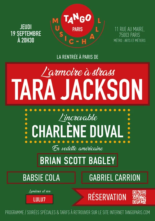 Dans la tradition des music-halls « d’avant », Charlène Duval lance une soirée mensuelle à partir du 19 septembre. La scène fera la part belle à la variété, la fantaisie, des talents très confirmés et en devenir, du 100 % live. On commencera avec Tara Jackson, avant le grand retour de Madame Raymonde les 28 et 29 octobre.