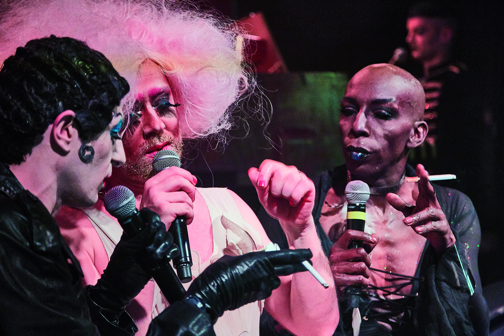 Basée sur la construction d’une œuvre sans fin sur sa propre vie, ces œuvres sont des témoins des différentes phases de son existence. Avec Fuck Me, Marina assise sur le rebord de la scène raconte l’histoire de son pays, l’Argentine, de la dictature à aujourd’hui. Là, cinq hommes uniquement vêtus de bottes et de grenouillères évoluent dans des déambulations rythmées pour s’adonner à un érotisme de cuir et de latex pittoresque, burlesque à souhait et étincelant. Un rendez-vous fascinant, sans tabou qui ose tout et laisse simplement bouche-bée d’étonnement.