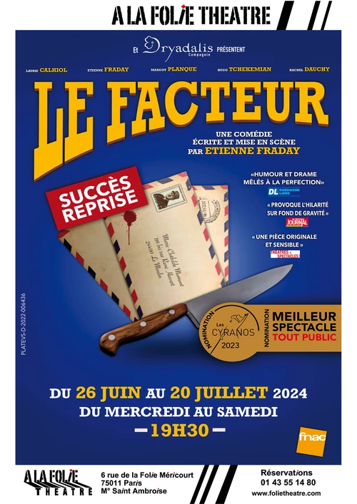 Oui, mais surtout il ne repassera plus ! C’est en effet ce que nous apprenons avec la surprenante confession de Marie-Clothilde et Lucienne. Dans une maison de campagne d’un petit village en 1946, elles avouent à Christian, le curé avoir tué accidentellement le facteur. Mais que faire ? Sans compter l’arrivée surprise d’Hélène, la sœur de Marie-Clothilde. 5 personnages, une succession de situations, des relations troubles, des rebondissements, des souvenirs de guerre qui ressurgissent, une tension palpable et grisante. Voilà ce qu’Etienne Fraday, l’auteur et metteur en scène de cette histoire qui a été nommée au Cyranos 2023 dans la catégorie « meilleur spectacle tout public » vous propose de découvrir du 26 juin au 20 juillet à La Folie Théâtre. On se laisse porter par l’incongruité des péripéties qui lient ce quintet. Cette comédie dramatique nous fait réfléchir sur où la conscience et l’intégrité de l’humain se manifestent en temps de guerre. Servi par des comédiens investis, ce vaudeville historique est juste captivant.