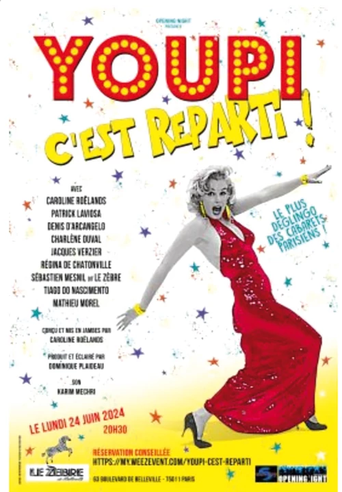 Youpi, c'est reparti ! Il se veut le plus « déglingo » des cabarets parisiens. Au milieu des strass et des trapèzes, la troupe propose une revisite loufoque de l’univers du music-hall. « Des chansons de bon goût, des danses endiablées, des tours de passe-passe, des attractions prodigieuses et des rebondissements improbables, servis par une petite bande d’artistes rares et aux talents multiples », nous propose le pitch. Ceux qui connaissent Denis D’Arcangelo (Madame Raymonde), Charlène Duval ou Régina de Chatonville approuvent, ceux qui ne connaissent pas hurleront des superlatifs à la fin du show !