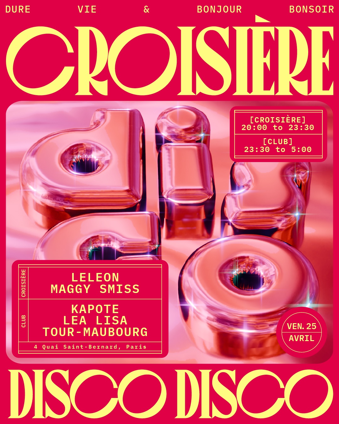 Ce n’est pas une faute de frappe mais bien une soirée conjointe des collectifs Dure Vie et Bonjour Bonsoir qui font du bien à nos soirées. Avec les beaux jours, on profitera de la Seine en mode afterwork/clubbing le 25 avril : embarquement à 19h, croisière pour s’émerveiller des joyaux de Paris sur des sons disco, funk, soul et house, puis retour à quai pour s’amuser jusqu’au petit matin. Comme on pense aussi à votre portefeuille, les prix sont tout petits, à noter dans ces temps où certaines soirées semblent seulement accessibles à Rotschild ou Rockfeller !).