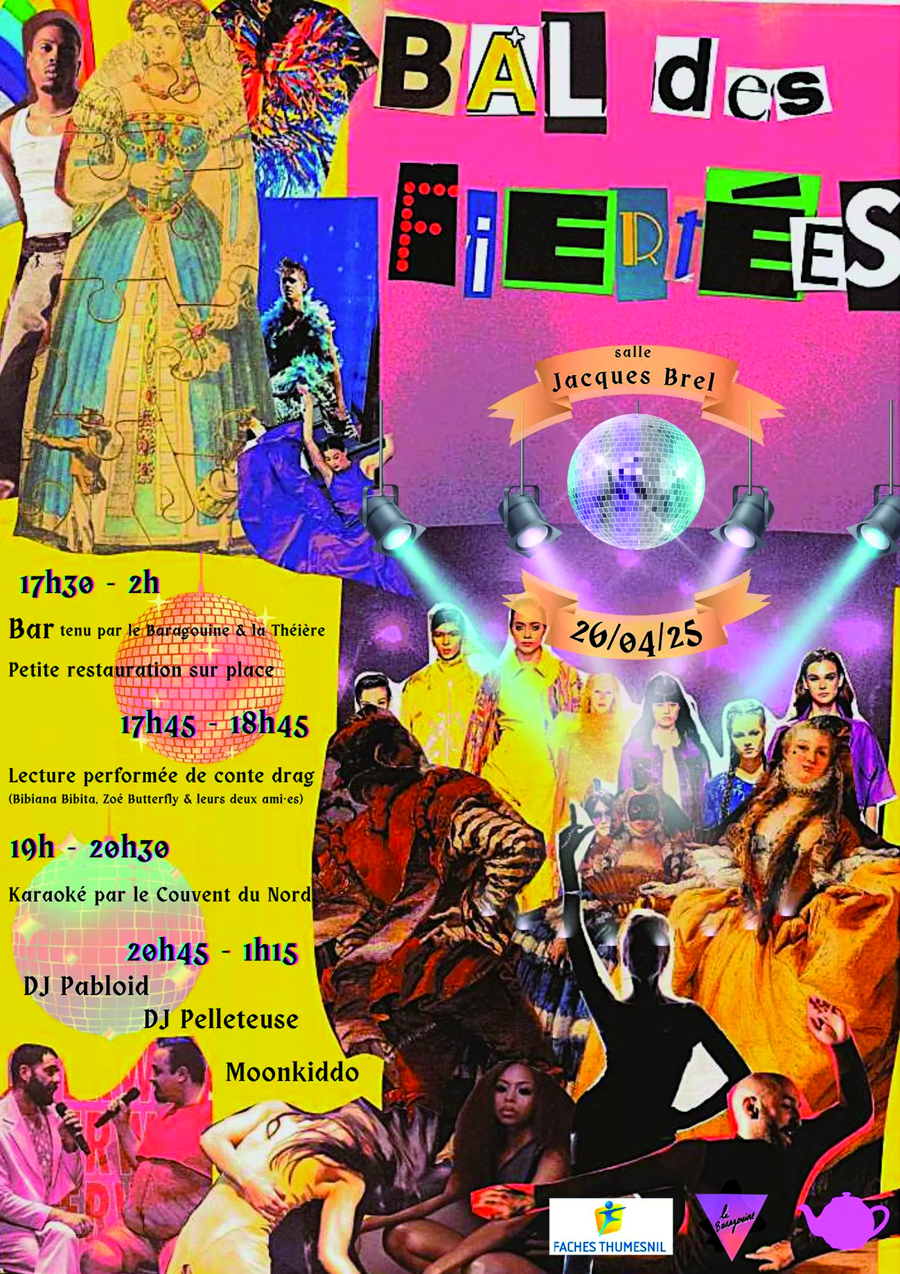 Le samedi 26 avril, la ville de Faches-Thumesnil accueillera le Bal des Fiertés à la Salle Jacques Brel. Le Baragouine et La Théière unissent à nouveau leurs forces et retournent dans leur fief auto-déclaré, Faches-Thumesnil, pour célébrer les Fiertés 2025. Le 26 avril, retrouvez-nous dès 17h30 à la salle Jacques Brel. Au programme : récits épiques contés par des drags féeriques, karaoke animé par le Couvent sacré et musette festive sur fond de DJ sets.