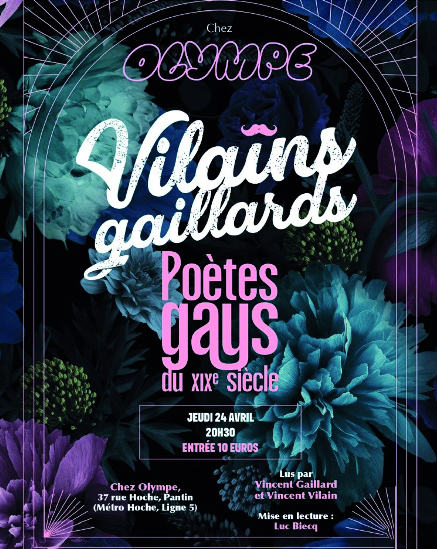 Quand la poésie grivoise et bien sentie fait l’éloge des amours masculines, c’est le duo de Vilains Gaillards qui remet le couvert. Le jeudi 24 avril à 20h30, la scène d'Olympe à Pantin vibrera au rythme des Vilains Gaillards, une lecture piquante de la poésie gay du XIXe siècle. Après un premier succès estival, ce spectacle met en lumière l'œuvre de 17 auteurs, de Rimbaud à Verlaine, célébrant le désir masculin avec humour et verve.