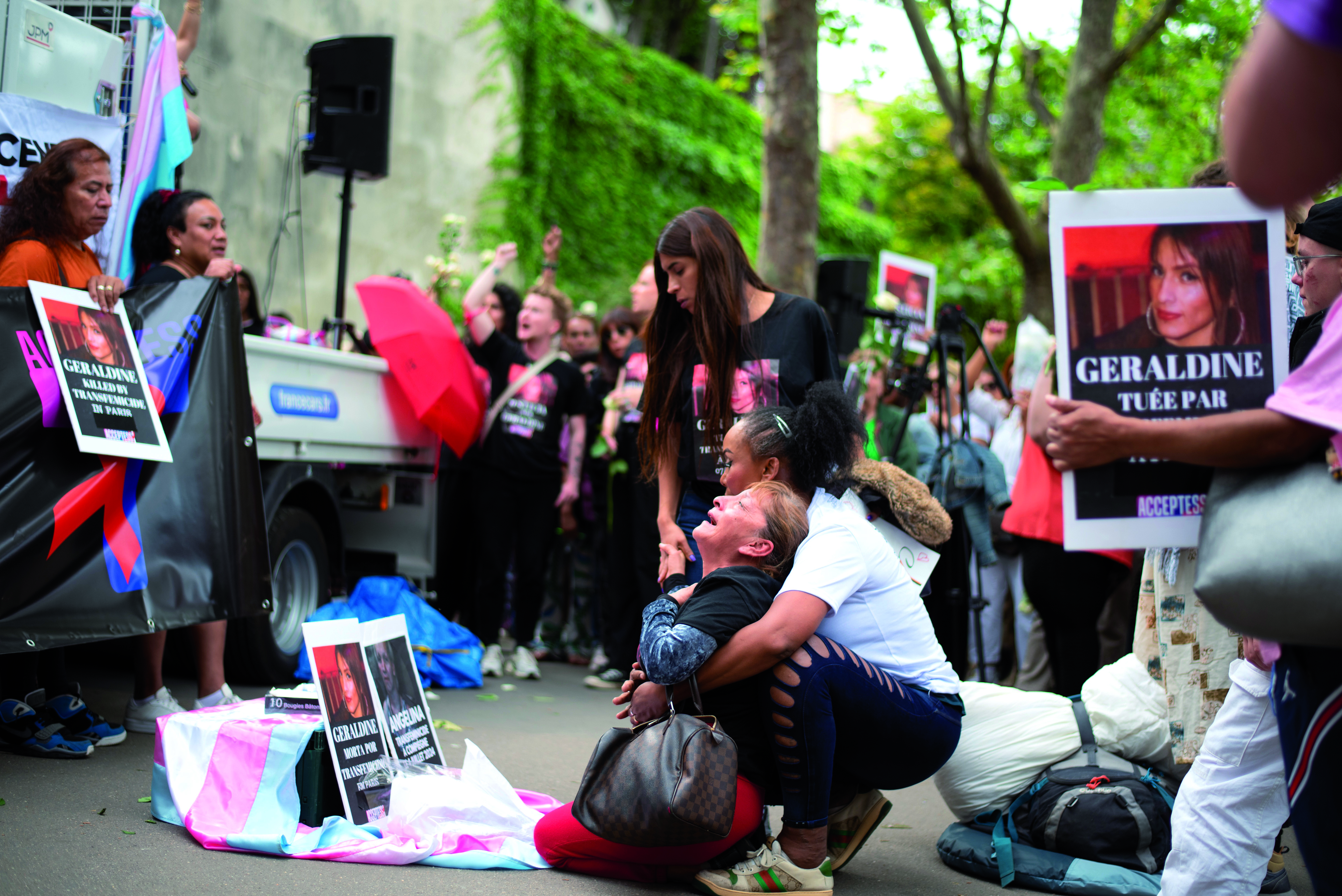 Il a fallu demander aux agents de sécurité postés devant le parvis des Droits de l’Homme où se trouvait le rassemblement pour les deux femmes trans assassinées la semaine précédente. Nous sommes le 16 juillet et à moins de deux semaines de l’ouverture des Jeux Olympiques, il n’est en effet plus possible de faire de manifestation sur le parvis du Trocadéro, face à la Tour Eiffel. La manifestation a donc lieu un peu à l’écart, comme nous l’indiquent les agents. Entre 100 et 200 personnes ont répondu à l’appel d’Acceptess T, du PASTT et du Strass pour dénoncer la transphobie et rendre hommage à Geraldine, une femme travailleuse du sexe de 30 ans, originaire du Pérou, assassinée à son domicile du XVIème arrondissement par un client et Angelina, 55 ans brutalement tuée à coups de hache par son ex compagnon à Compiègne. Toutes les deux sont mortes à quelques jours d’intervalle début juillet. Le meurtrier de Géraldine s’est rendu lui-même à la police. Il a expliqué avoir « paniqué » en découvrant que Géraldine était une femme trans. Un argumentaire classique des meurtres homophobes et transphobes, qui ne trompe pas grand monde. D’autres rassemblements ont eu lieu en France avant et après l’événement parisien. Au Trocadéro, la soirée oscille entre moments bouleversants, avec la prise de parole de la mère de Géraldine, venue de Lima, et révolte avec les différentes interventions associatives. Beaucoup rappellent les meurtres d’autres femmes trans, comme Vanesa Campos (en 2018) ou Jessyca Sarmiento (en 2020), toutes deux assassinées au Bois de Boulogne. Et ce ne sont que les cas médiatisés…